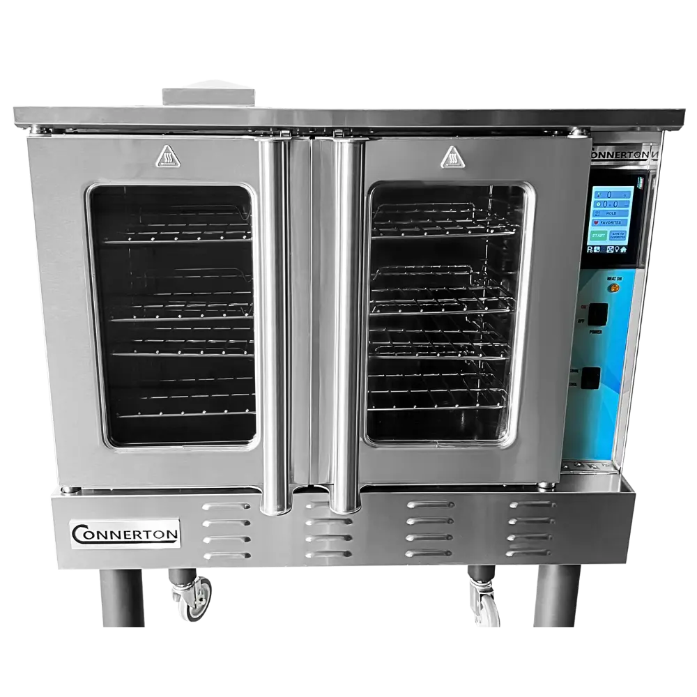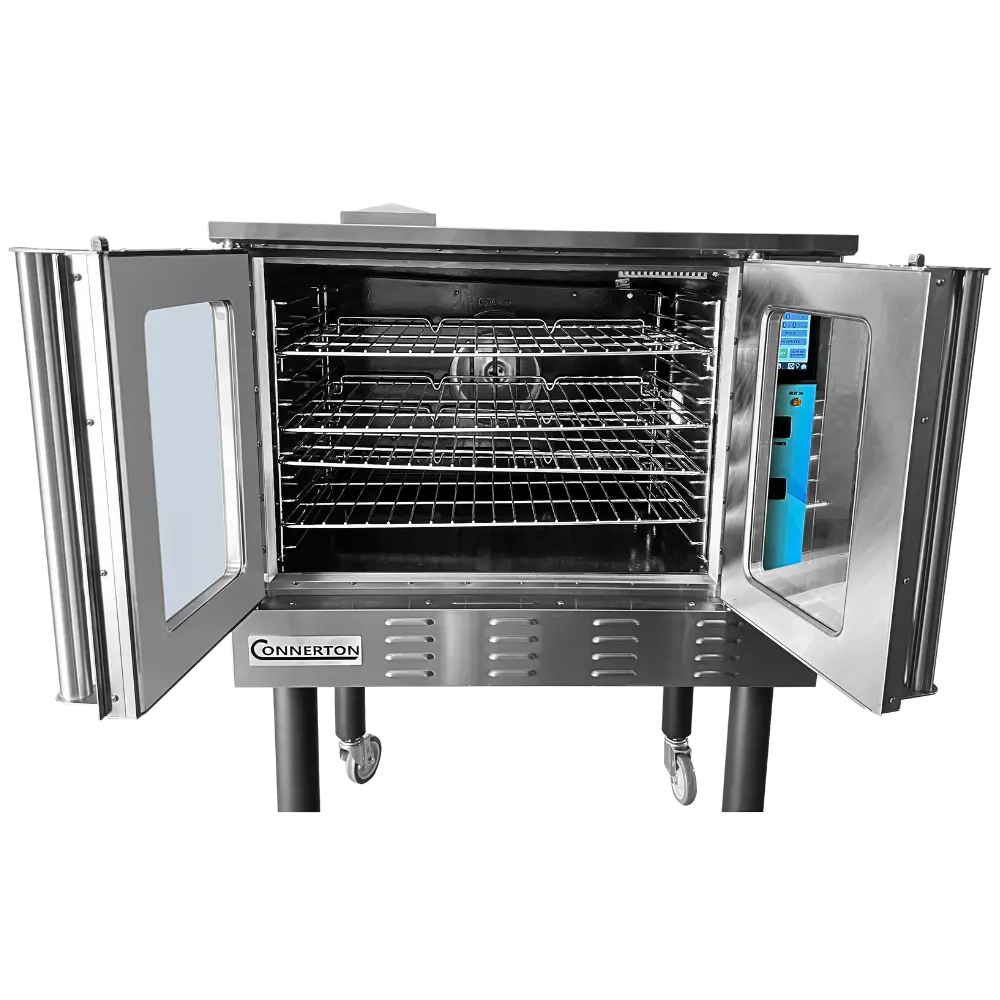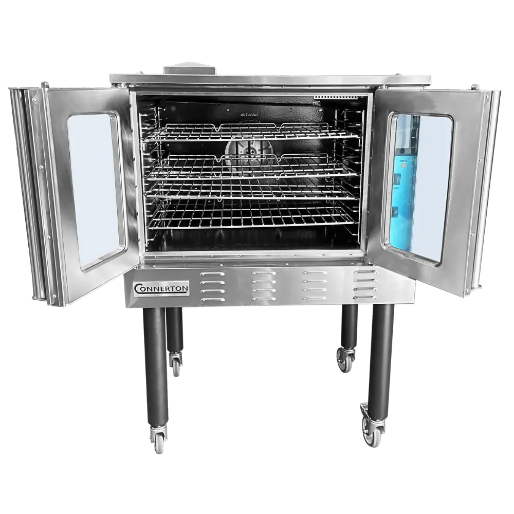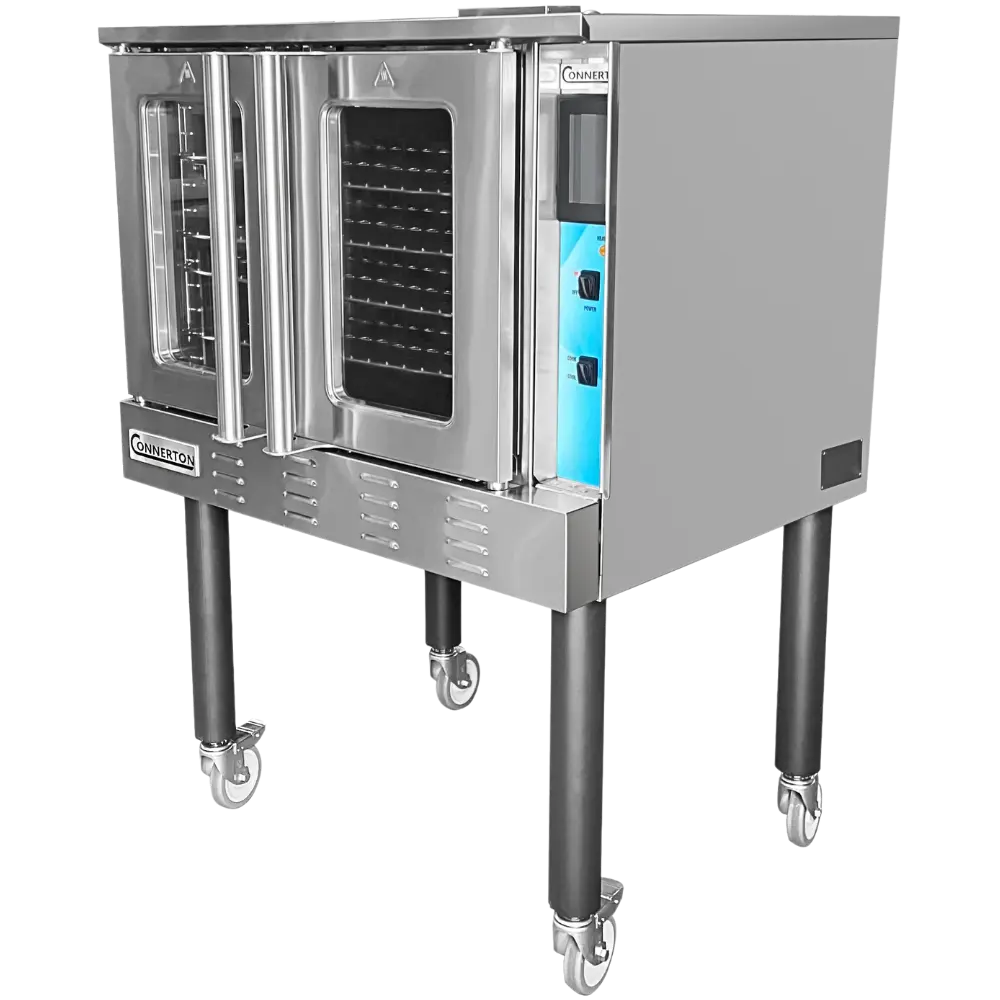 - Commercial gas convection oven with stainless steel construction and 1/2 HP two-speed blower